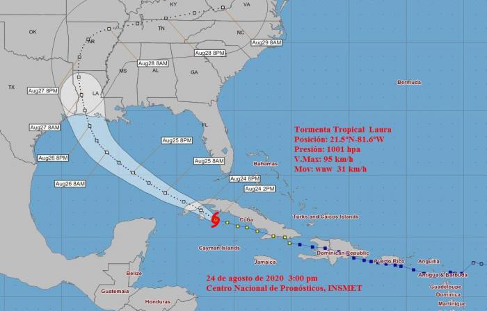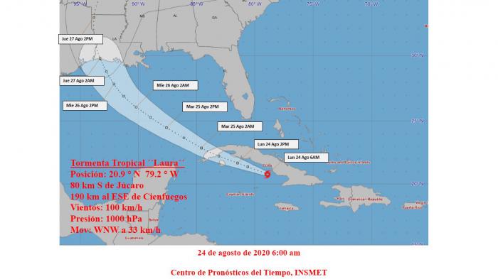 Se pronostica que en las próximas horas Laura continuará ganando algo más en organización e intensidad, y se moverá con similar rumbo y velocidad de traslación, para internarse más en aguas del golfo de México, alejándose de Cuba y con posibilidad convertirse en un huracán hoy martes en la tarde.