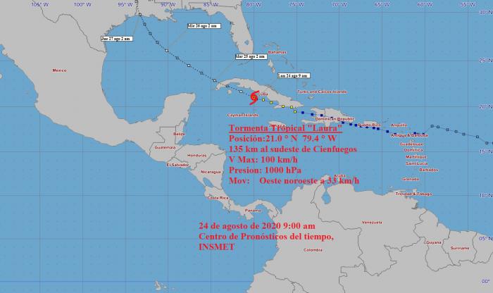 Se pronostica que en las próximas horas Laura continuará ganando algo más en organización e intensidad, y se moverá con similar rumbo y velocidad de traslación, para internarse en aguas del golfo de México, alejándose de Cuba y con posibilidad convertirse en un huracán hoy martes en la tarde.