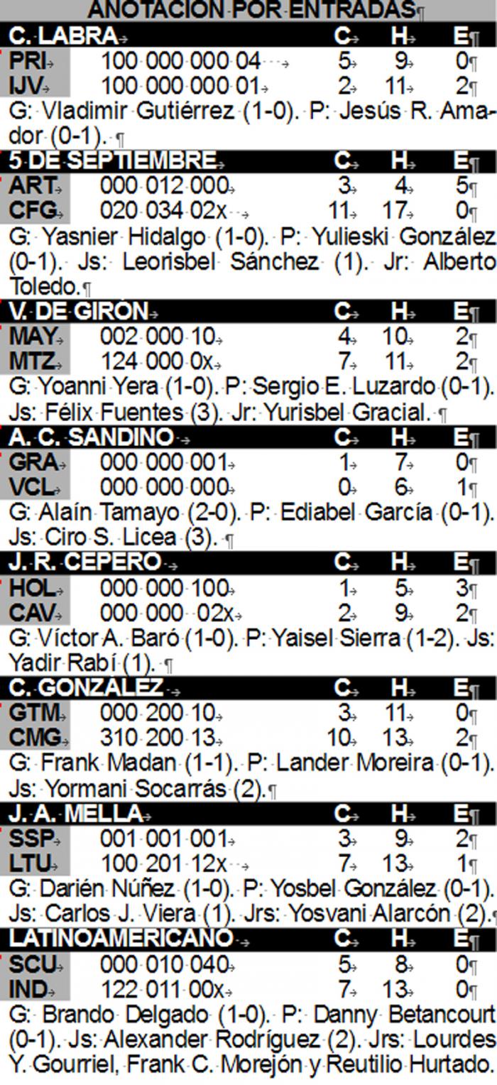 El zurdo Yunier Gamboa tiró ocho innigs completos desde la lomita isleña sin permitir libertades a los monarcas de la campaña precedente. Toleró solo tres jits, todos sencillos, ponchó a uno y regaló un boleto, mientras sus compañeros fabricaron la única del juego en la cuarta entrada, empujada por el bate del veterano Luis Felipe Rivera, que remolcó a Rigoberto Gómez. La cuarta derrota pinareña volvió sobre los hombros de su astro Yosvani Torres, quien no ha podido hacerse justicia en las dos aperturas de esta todavía joven 54 Serie Nacional.