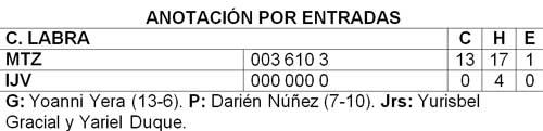 Matanzas pasó tres días, los de sus reveses consecutivos con anémica ofensiva de 219 (25 jits en 114 turnos); errática defensa de 946 (ocho errores en 139 lances) y un pitcheo, de 3,48, que si bien fue mejor que el de sus adversarios, sufrió por el pésimo respaldo al campo de sus jugadores. Sin embargo, en el desafío de ayer, cuando no tenían un mañana más, el día en que era obligado ganar, pegaron 17 imparables, incluyendo seis dobles, un triple y dos jonrones. Y como si fuera poco, octavo y noveno, produjeron de 8-4 para apuntalar a un efectivo Yoanni Yera, que dejó sin marcar a los anfitriones en seis y un tercio.