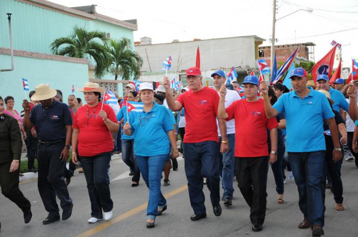 Abelardo Álvarez Gil, miembro del Secretariado del Comité Central del Partido, junto a José Ramón Monteagudo Ruiz, primer secretario del PCC en Sancti Spíritus; Teresita Romero Rodríguez, presidenta de la Asamblea Provincial del Poder Popular y representantes del movimiento obrero encabezaron la marcha en la ciudad cabecera que tuvo su punto culminante en la Plaza de la Revolución Mayor General Serafín Sánchez Valdivia.