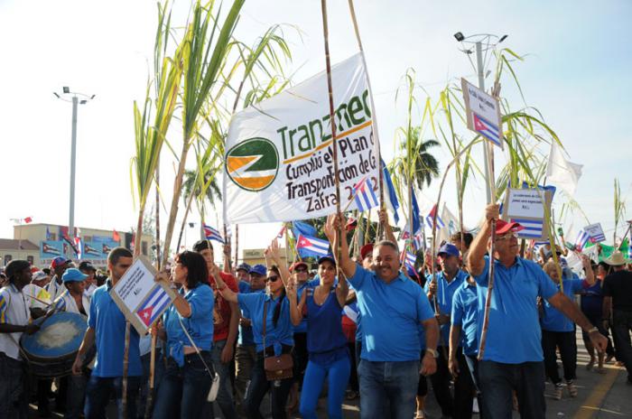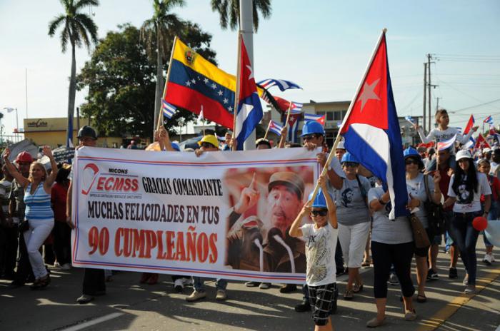 Representantes de 17 sindicatos desfilaron de manera compacta en la capital provincial, una muestra de respaldo a la Revolución que la central obrera dedicó al cumpleaños 90 de Fidel, líder de la Revolución y animador de estos festejos en todo el país, y que ratificó el apoyo de los trabajadores y de los cubanos en general a los pronunciamientos emanados del reciente 7mo. Congreso del Partido.