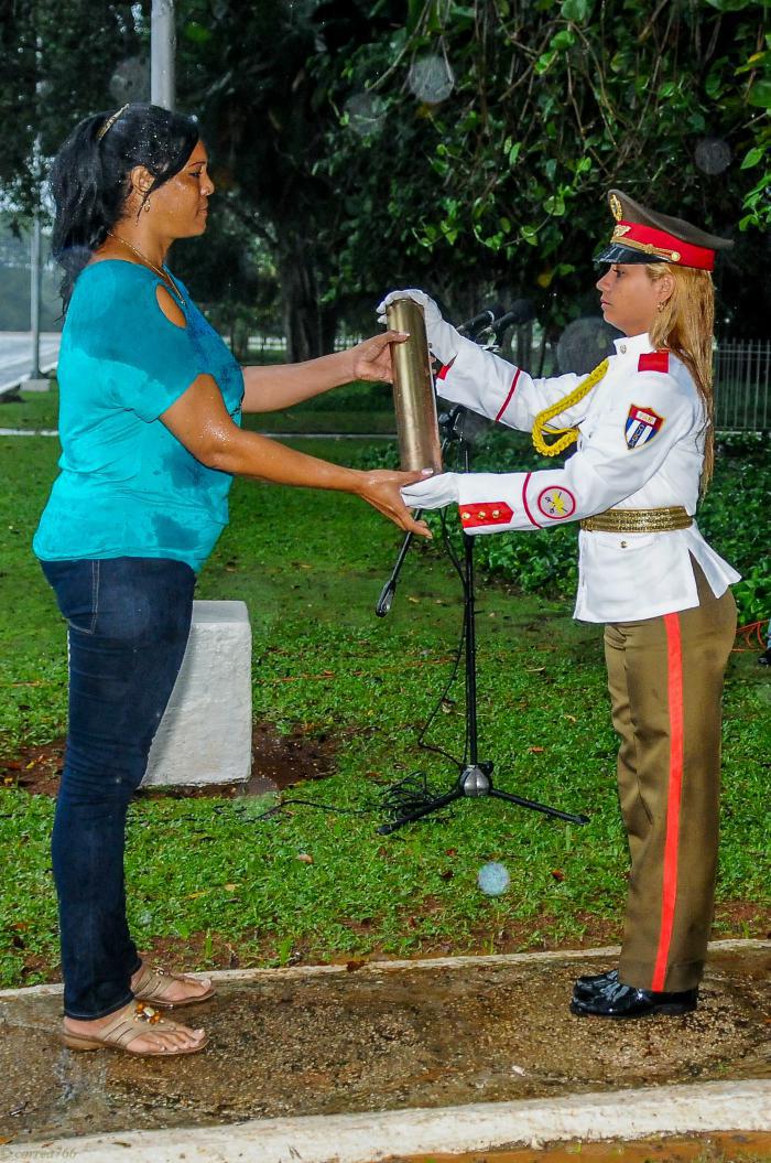 Y fue bajo la lluvia, como para exaltar el simbolismo, que aconteció, en la mañana de este lunes, la ceremonia de extracción de la cápsula con el texto que, al decir de Ronal Hidalgo Rivera, segundo secretario de la Unión de Jóvenes Comunistas (UJC), «resume patriotismo y fe», y constituye «argumento oportuno para reforzar la convicción de las nuevas generaciones de que son la continuidad de la historia revolucionaria».
