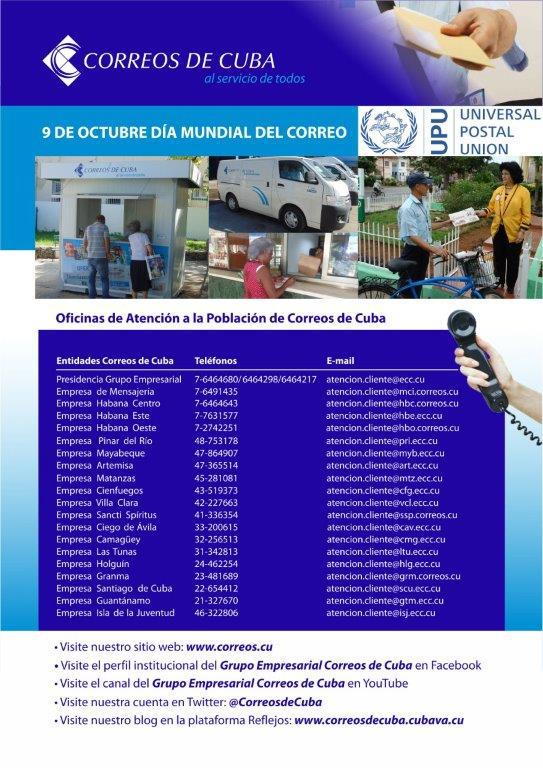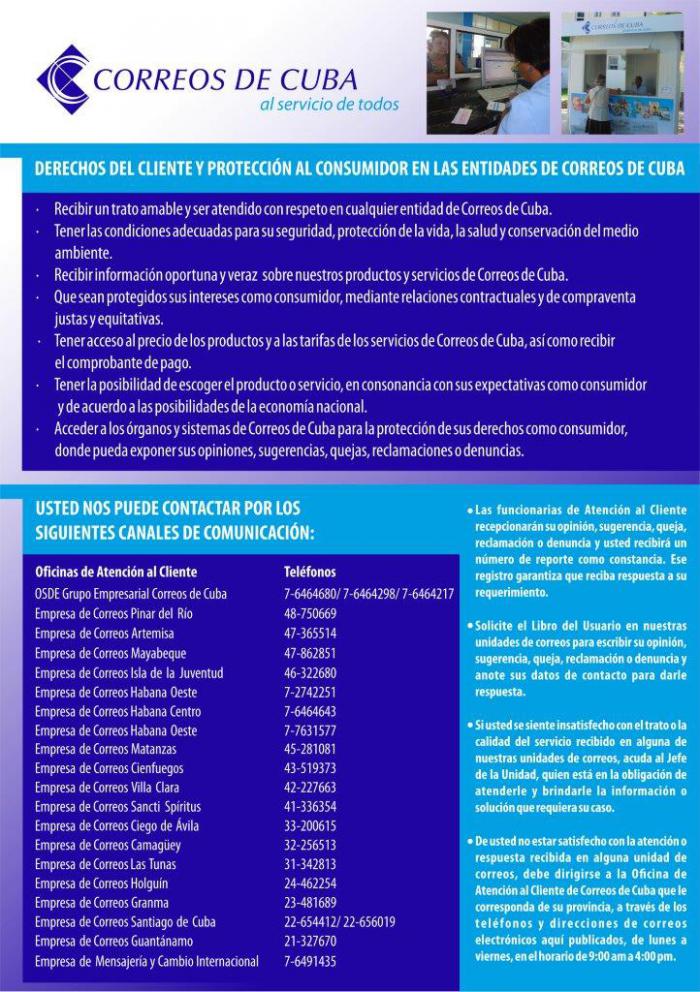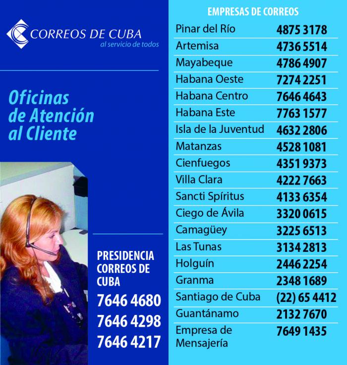 –Correos: En nuestra web www.correos.cu contamos con un rastreador de servicios para los clientes conocer el estado y ubicación de sus envíos en tiempo real. También pueden contactarnos a través de la sección «Puede comentarnos», la página en Facebook del Grupo Empresarial Correos de Cuba, y los teléfonos y correos de Atención al Cliente o de nuestras empresas, publicados en la contraportada de la revista Bohemia.