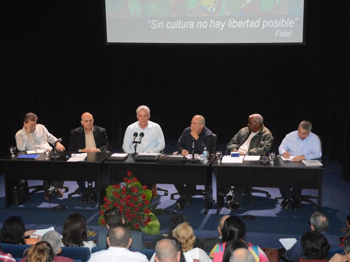 Consciente de que la cultura es fortaleza, vigor y esencia y la base de nuestra identidad, el Presidente se dirigió a un público integrado por directivos del Ministerio, de las instituciones culturales y destacados intelectuales, en el que se encontraban, además, Esteban Lazo Hernández, presidente de la Asamblea Nacional del Poder Popular y del Consejo de Estado; Roberto Morales Ojeda, viceprimer ministro; Víctor Gaute, miembro del Secretariado del Comité Central del pcc; Ulises Guilarte de Nacimiento, secretario general de la Central de Trabajadores de Cuba, y Alpidio Alonso, ministro de Cultura.