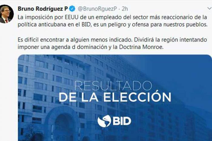 «La imposición por EE. UU. de un empleado del sector más reaccionario de la política anticubana en el BID, es un peligro y una ofensa para nuestros pueblos. Es difícil encontrar a alguien menos indicado. Dividirá la región intentando imponer una agenda de dominación y la Doctrina Monroe», denunció la designación de Mauricio Claver-Carone a ese puesto, el ministro de Relaciones Exteriores de Cuba, Bruno Rodríguez Parrilla, a través de su cuenta en Twitter.