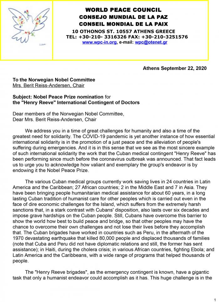 Nos dirigimos a ustedes en un tiempo de grandes desafíos para la humanidad, y también un tiempo de la mayor necesidad de solidaridad. La pandemia COVID-19 es otro ejemplo de cuán esencial resulta la solidaridad internacional en la promoción de una paz justa y en el alivio del sufrimiento de las personas durante las emergencias. Y es en este sentido que vemos como el más sincero ejemplo de tal solidaridad internacional el trabajo que el contingente médico cubano “Henry Reeve” ha venido realizando desde mucho antes de que se anunciara el brote del coronavirus. Ese hecho nos lleva a instarles a reconocer cuán valiente y ejemplar es el esfuerzo del grupo concediéndole el Premio Nobel de la Paz.