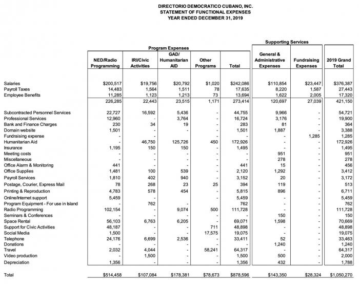 Algunas de las organizaciones son el Directorio Democrático Cubano, Inc. Una auditoría de febrero de 2021 muestra que la ONG con sede en Miami gastó $ 1,050,270 en programación de radio, ayuda humanitaria, actividades cívicas y otros programas en 2019. Entre los objetivos del Directorio están las acciones de subversión en el plano cultural y en la juventud cubana.