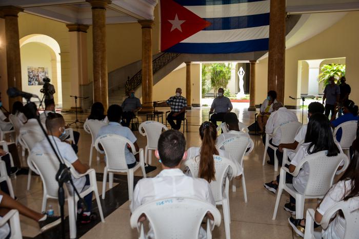 Ustedes –les dijo con orgullo– representan esas tres cosas. Ustedes son estudiantes, esencia de la política educacional que ha desarrollado la Revolución y cuyo arquitecto fue el Comandante en Jefe; estudiantes de Ciencias Médicas, la otra gran conquista social que desarrolló Fidel; y se les forma también con vocación científica, desde donde actualmente se le han aportado al país las posibilidades del enfrentamiento a un problema tan complejo como la COVID-19.