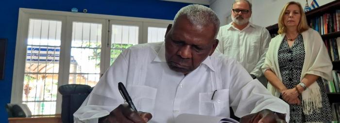 «Desde Cuba, en nombre del General de Ejército Raúl Castro Ruz; del Presidente de la República de Cuba, Miguel Díaz-Canel Bermúdez; y del pueblo cubano; extendemos nuestras condolencias, cariño y solidaridad a Lucía Topolansky, a su familia, al Gobierno y a todo el pueblo uruguayo en este momento de dolor», plasmó este viernes el miembro del Buró Político del Partido, Esteban Lazo Hernández, presidente de la Asamblea Nacional del Poder Popular y del Consejo de Estado, en el libro de condolencias abierto en la Embajada de la República Oriental del Uruguay, con motivo del fallecimiento del expresidente de la nación sudamericana, José Alberto Mujica Cordano.