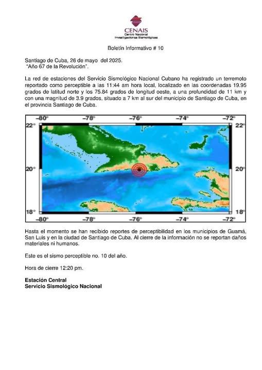 La red de estaciones del Servicio Sismológico Nacional Cubano ha registrado un terremoto reportado como perceptible a las 11:44 am hora local, localizado en las coordenadas 19.95 grados de latitud norte y los 75.84 grados de longitud oeste, a una profundidad de 11 km y con una magnitud de 3.9 grados, situado a 7 km al sur del municipio de Santiago de Cuba, en la provincia Santiago de Cuba, informó hoy, el Centro Nacional de Investigaciones Sismológicas (CENAIS).