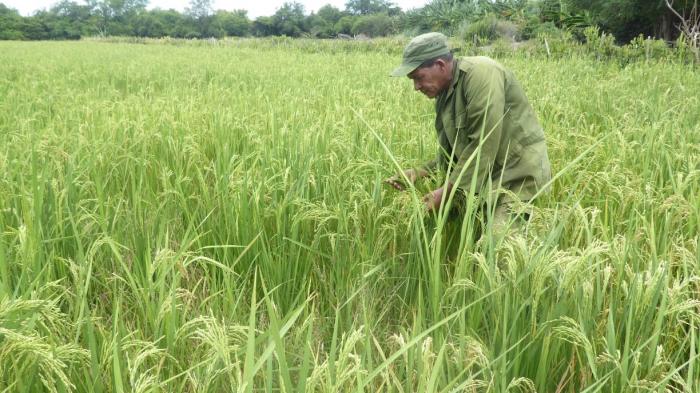 Apenas dos hectáreas, «ya casi listas para entrar en cosecha», precisa Omaily Ramírez Samón, mientras las examina. Él es «el brazo derecho» de Ireno, su hermano, dueño de la parcela y «pionero en la siembra de arroz por aquí».
