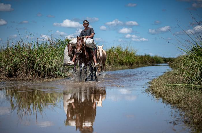 Se llama Duyernis y anda con dos caballos que se están comiendo la yerba recién cortada que cargan otros dos. «Mira cómo se han flaqueado, metidos en el agua hasta la rodilla», suelta. Y, si le preguntas cómo hará para engordarlos de nuevo, dice que «será cuando baje eso ahí. La yerba podrida ellos no se la comen, y hay muchas plagas también, mosquitos, jejenes…».