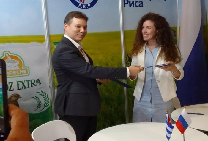 Rubricaron el documento de formalización del contrato Pavel Reyes Liubushkin, presidente del Consorcio Ruso del Arroz, y Elizabeth Pagés Navarrete, máxima representante de la entidad cubana.