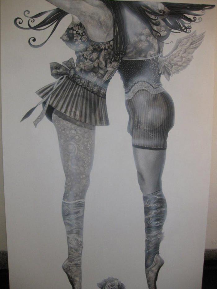Hay quienes se inspiran en las bailarinas (Alicia está presente como ícono y Maestra en muchas piezas), y se le rinde homenaje en una obra por su titánica faena de bailar Con los ojos del alma; las zapatillas de puntas alcanzan disímiles formas en la imaginación de los artistas porque son el instrumento que las hace “volar”, de ahí toman presupuestos para trabajarlas: dos, unidas por los calcañales forman un arco que es puente de amor; y esas otras zapatillas con piel de plumas, son cisnes que quieren escaparse de su jaula (cuerpo) para volar.
