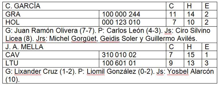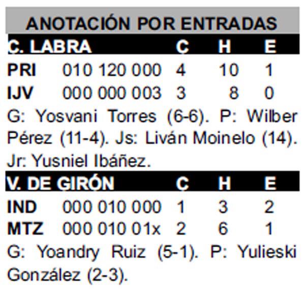 Excelente el trabajo de Yosvani Torres durante ocho entradas, colgando ocho ceros, permitiendo cinco jits y, como casi siempre, sin regalar boletos de libre tránsito. No debió haber abierto el noveno, pero lo dejaron y no lo extrajeron del box hasta permitir tres metrallazos seguidos —de Dai­nier Gálvez, Rigoberto Gómez y Luis Felipe Rivera—, que pusieron en peligro el triunfo, complicado además por un costoso error del camarero Michel González.
