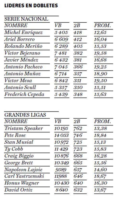 Por primera vez en las múltiples tablas estadísticas publicadas en esta sección Temas Beisboleros, cuatro zurdos clasifican entre los diez primeros. Ariel Borrero, ya retirado, es el puntero de todos con sus 412 biangulares, buena parte de ellos colocando la pelota entre los jardines derecho y central. Borrero, apodado El Remolcador por su habilidad para impulsar carreras, fue un puntal de Cuba en el triunfo ante Venezuela en el Primer Clásico Mundial, al conectarle un sencillo al mejor lanzador zurdo de las Grandes Ligas en ese momento, Johan Santana, para fletar una carrera importante.
