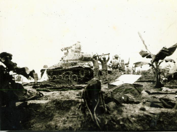 Sobre el bunker del puesto de mando francés fue izada la bandera vietnamita con la inscripción del presidente Ho Chi Ming que decía: “Decididos a combatir y resueltos a vencer”