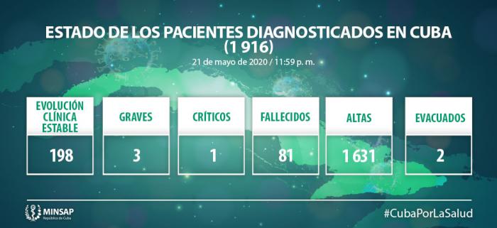 - Ciudadano cubano de 58 años de edad, residente en el municipio Matanzas, provincia del mismo nombre. Contacto de caso confirmado anteriormente. Se mantienen en vigilancia 20 contactos.