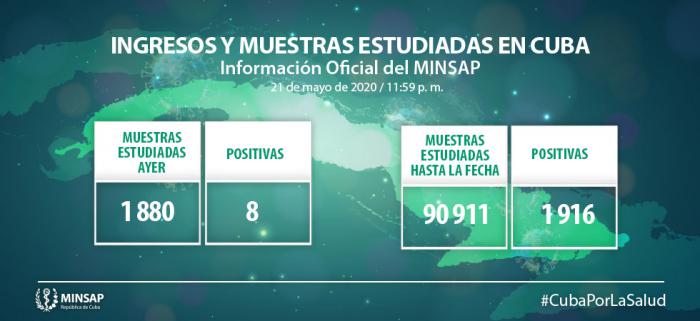 Para COVID-19 se estudiaron mil 880 muestras, resultando ocho muestras positivas. El país acumula 90 mil 911 muestras realizadas y mil 916 positivas (2,1%). Por tanto, al cierre del día de ayer se confirman ocho nuevos casos, para un acumulado de mil 916 en el país.