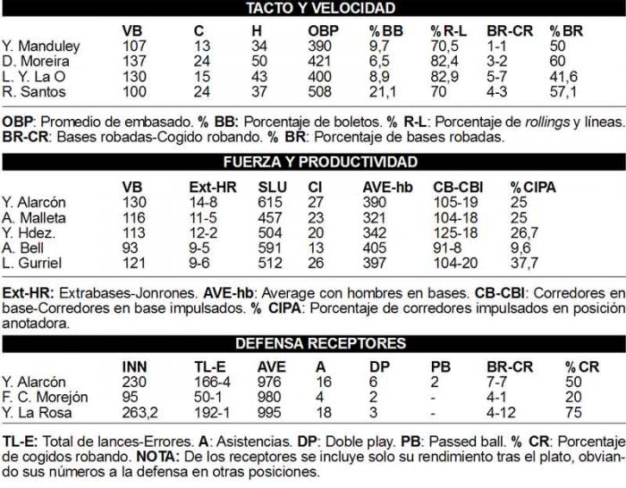 En este análisis del colectivo nos centramos en los jugadores de posición, y para tener una idea más fiel de cada pelotero los dividimos de acuerdo con sus características: por una parte los que sobresalen por el tacto y la velocidad, y por otro los sluggers que tienen sobre sus hombros la responsabilidad de producir, además de un vistazo al rendimiento defensivo de los receptores.