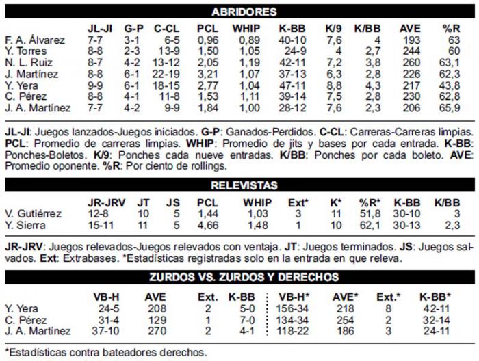 El cuerpo de pitcheo seleccionado cuenta con mayoría de abridores, aunque algunos de ellos saldrán desde el bullpen para relevos largos o situaciones específicas. Al margen de esto, los ubicamos en el grupo de abridores porque sus estadísticas en la presente temporada solo nos permiten evaluarlos como tal.