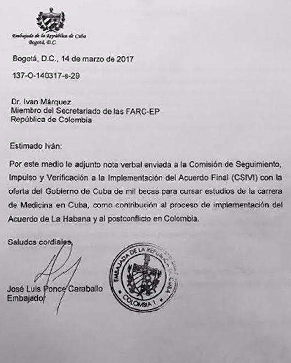 BOGOTÁ.— El embajador de Cuba en Colombia, José Luis Ponce, informó que su país otorgará al gobierno colombiano y a las FARC-EP un fondo de mil becas para estudiar medicina en la isla en los próximos cinco años.