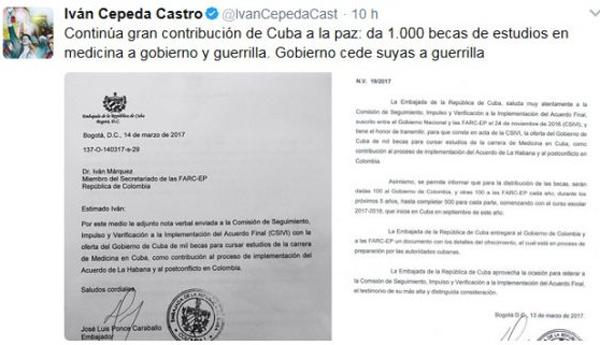 En su cuenta Twitter, Márquez destacó que esta contribución de Cuba al proceso de implementación del Acuerdo de La Habana y al postconficto en Colombia es un gesto puro de humanidad.