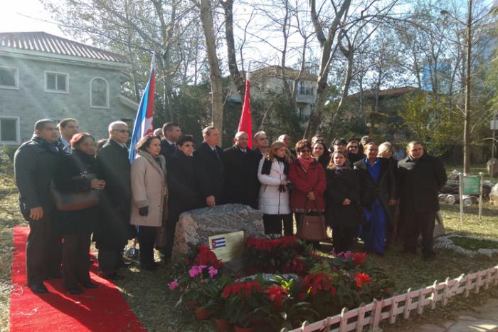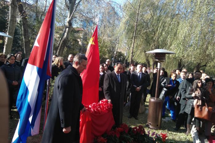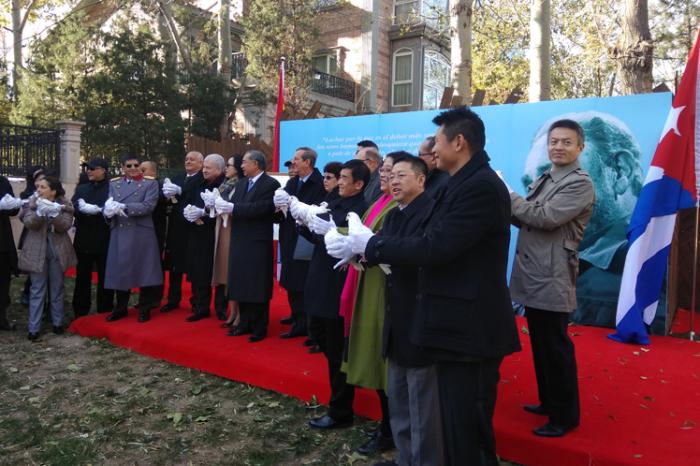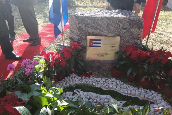 El embajador de La Habana aquí, Miguel Ángel Ramírez, y Li Ruohong, presidente de la Fundación China para la Paz Mundial, develaron ese símbolo ante miembros del gobernante Partido Comunista de este país, la Cancillería local, misiones diplomáticas y amigos de la isla.