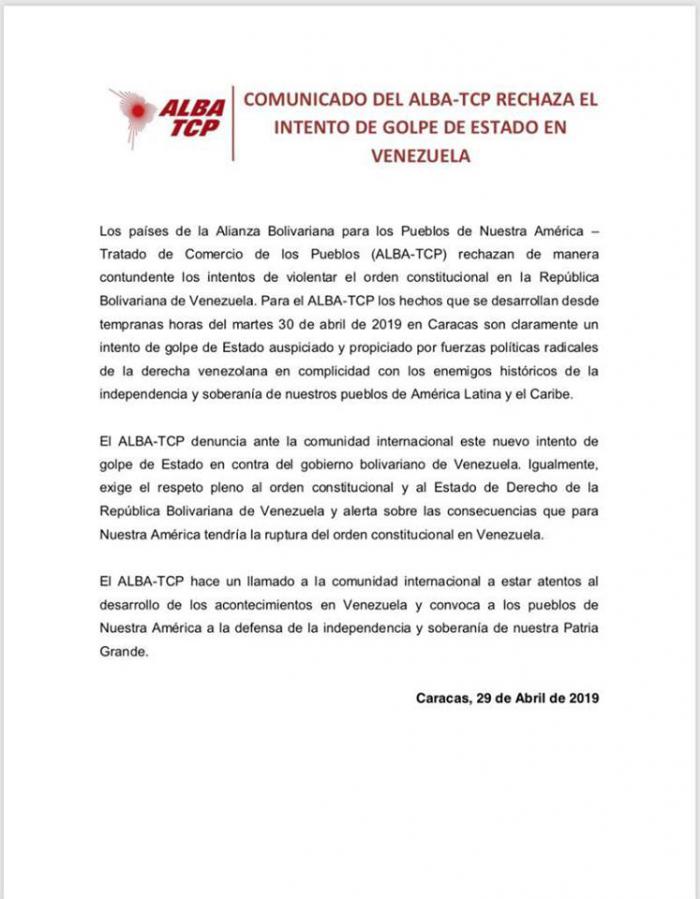 La Alianza Bolivariana para los Pueblos de Nuestra América -Tratado de Comercio de los Pueblos emitió un comunicado en el que rechaza los «intentos de violentar el orden constitucional».