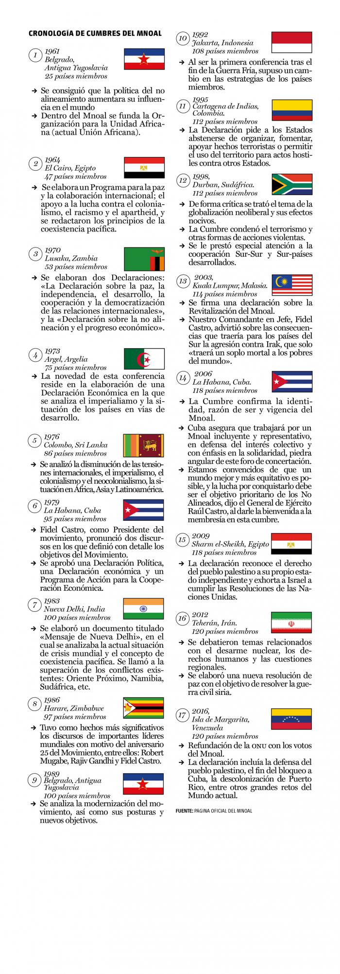Nuestro país, plenamente comprometido con el Movimiento, acogió en La Habana la celebración de dos Cumbres de Jefes de Estado y de Gobierno del Mnoal (1979 y 2006), en las que asumió la Presidencia.