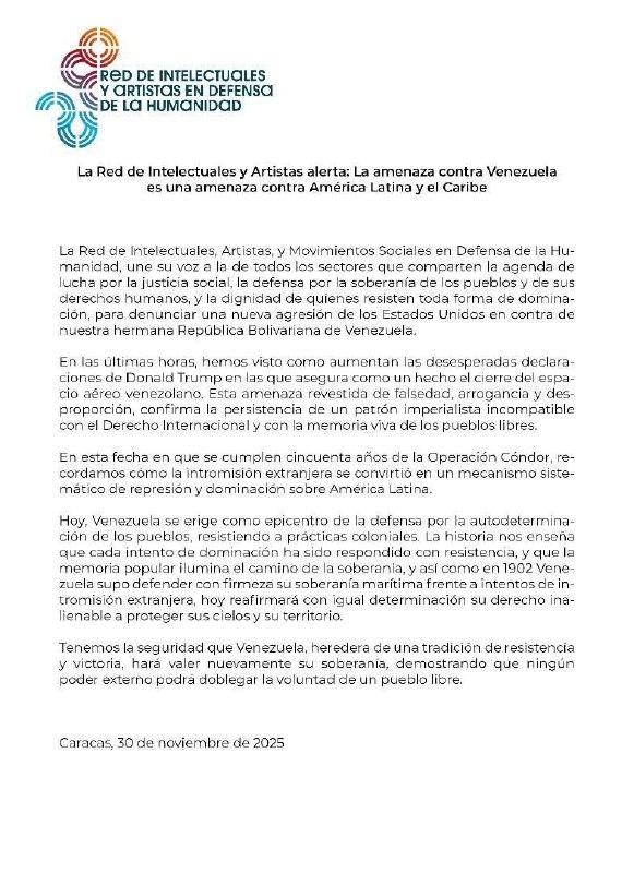 La Red de Intelectuales, Artistas, y Movimientos Sociales en Defensa de la Humanidad, une su voz a la de todos los sectores que comparten la agenda de lucha por la justicia social, la defensa por la soberanía de los pueblos y de sus derechos humanos, y la dignidad de quienes resisten toda forma de dominación, para denunciar una nueva agresión de los Estados Unidos en contra de nuestra hermana República Bolivariana de Venezuela. En las últimas horas, hemos visto como aumentan las desesperadas declaraciones de Donald Trump en las que asegura como un hecho el cierre del espacio aéreo venezolano. Esta amenaza revestida de falsedad, arrogancia y desproporción, confirma la persistencia de un patrón imperialista incompatible con el Derecho Internacional y con la memoria viva de los pueblos libres.