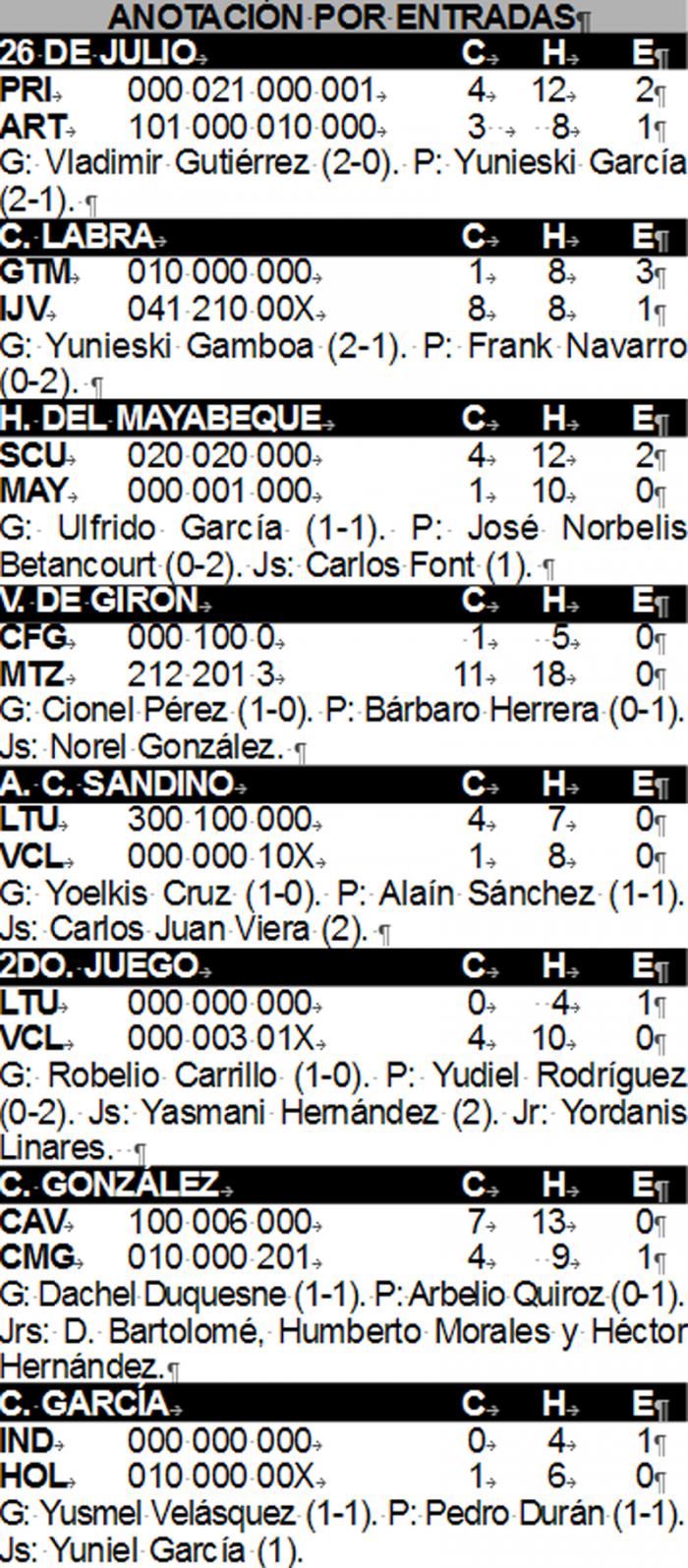 En sentido general, fue una jornada movida, con par de duelos en Villa Clara tras el intenso aguacero del miércoles, y un dilatado encuentro en Artemisa, donde Pinar del Río salvó la honrilla frente a los Cazadores, que tuvieron la carrera del triunfo en tercera pero no lograron descifrar los envíos del veloz Vladimir Gutiérrez.