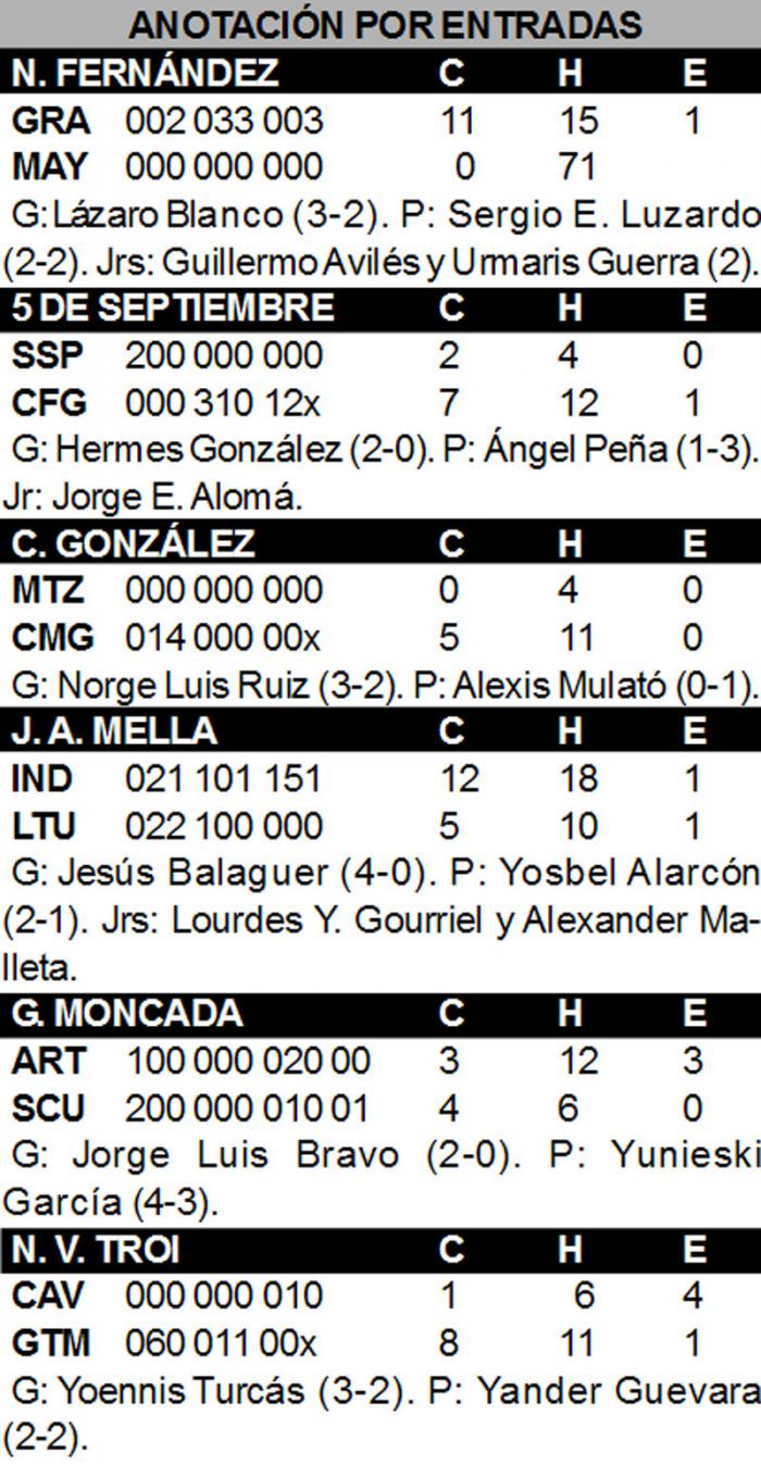 Por último, Granma superó a Mayabeque en el pleito inicial, con lechada de Lázaro Blanco, y en el segundo partido sellaron con paridad 9-9 en el octavo capítulo por lluvia.