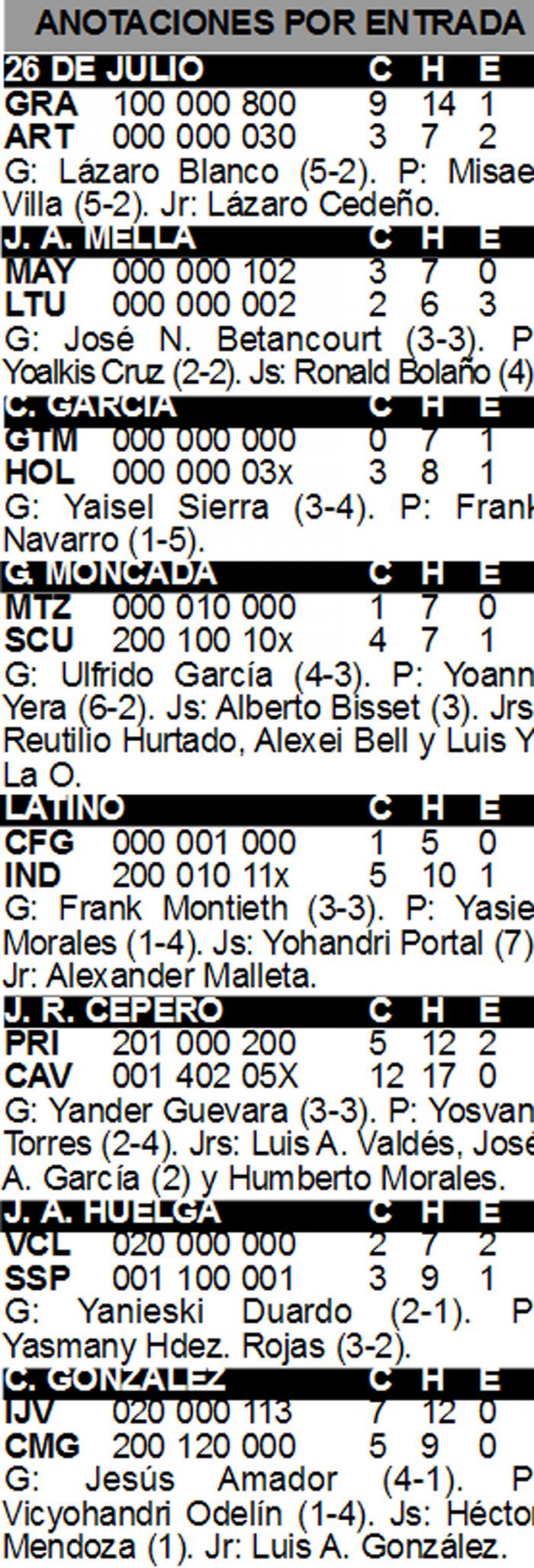 No obstante, mantuvo el choque con ventaja mínima para el elenco oriental hasta el séptimo, cuando tres de sus relevistas soportaron cinco carreras que definieron el de-safío. Por los ganadores, el diestro Lázaro Blanco caminó siete entradas sin contratiempos, con solo cuatro jits aceptados y dos ponches, apoyado en feroz ofensiva de Lázaro Cedeño (jonrón y cuatro remolques), Guillermo Avilés y Yordanis Samón, estos últimos con tres inatrapables cada uno.