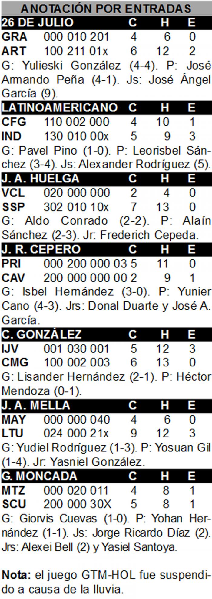 Espectacular fue el triunfo agramontino al dejar al campo a los Piratas pineros, a pesar de contar en el box con el cerrador Héctor Mendoza, quien tiró un wild que les abrió las puertas a la carrera de la victoria. Mucho más cómodo el éxito de los Leñadores de Las Tunas ante Mayabeque, con Yudiel Rodríguez colgando cinco ceros y Carlos Juan Viera cerrando a todo tren; por los perdedores el designado Yasniel González conectó el jonrón número 18 con bases llenas de la justa. Y en el Latino, cerrada pero victoria al fin, los Azules le pasaron la escoba a los Elefantes de Cienfuegos, con dos impulsadas por Yunieski Gurriel y buena labor del zurdo Pavel Pino.