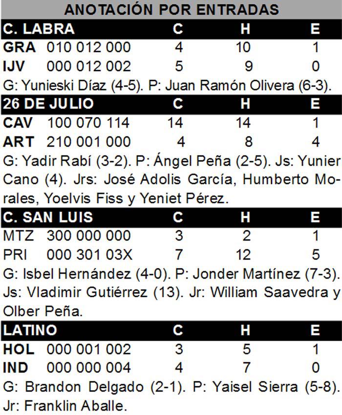 Fue esta una espectacular “dejada al campo”, cuando el equipo de Carlos Martí llegó al noveno con mínima ventaja en el pizarrón y el relevista Juan Ramón Olivera había hecho un buen trabajo durante dos entradas. Pero en el noveno perdió por completo su efectividad y abandonó el box dejando las bases llenas sin out, luego de permitir la carrera del empate por sencillos consecutivos de Dainier Gálvez, Michel Enríquez y Luis Felipe Rivera.