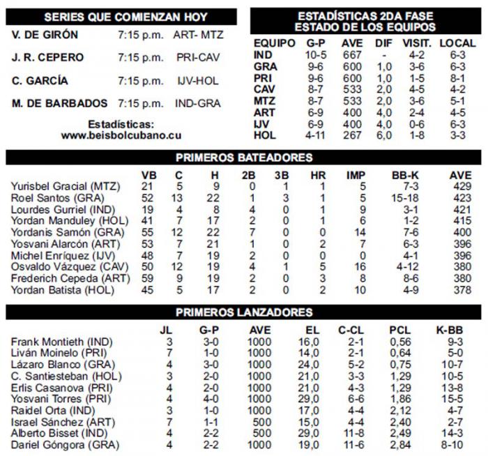 Sorpresa resultará para muchos el estado de los equipos, donde Industriales ha sido el que presenta mejor balance, con diez triunfos en 15 salidas. Y también llama la atención ver a los Cocodrilos matanceros empatados en cuarto lugar con los Tigres avileños, luego de perder en seis de sus últimas nueve salidas al diamante, aunque en favor de ellos pudiera afirmarse que ningún colectivo es capaz de mantener una racha ganadora durante una competencia larga como la nuestra, de 87 partidos sin incluir los play off.