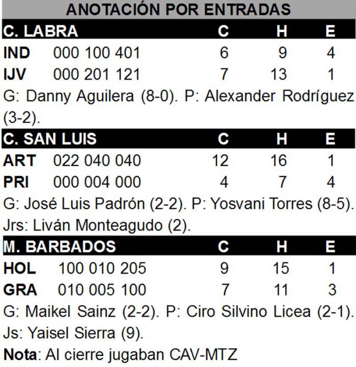 En ese grupo, los pineros luchan a brazo partido por mejorar su ubicación en los pasados tres campeonatos (séptimo escaño), y este martes metieron presión a Ciego de Ávila y Pinar del Río con su victoria vespertina ante los Leones de Lázaro Vargas, improductivos (12 corredores quedaron en circulación), blandos en defensa (cuatro errores) y sin efectividad sus relevistas, que ya habían sido bateados con libertad el pasado fin de semana. Básicamente, contra esos lanzadores del bullpen los Piratas pineros fabricaron las carreras decisivas y dejaron tendidos en la grama a Industriales, con inatrapable de oro conectado por el receptor Luis Abel Castro, que ya había remolcado otra anotación.