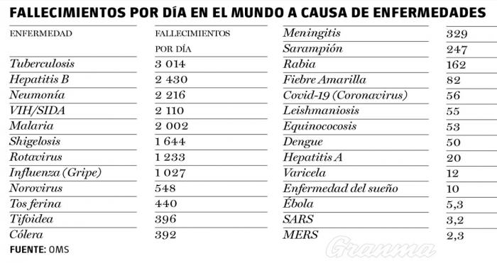 El pasado 9 de marzo, dos fechas antes de que la oms elevara la calificación de la Covid-19, ese órgano de las Naciones Unidas hizo público un gráfico que causa espanto. La información recoge los fallecimientos que se producen por día (sí, cada 24 horas) en el mundo por 26 dolencias.