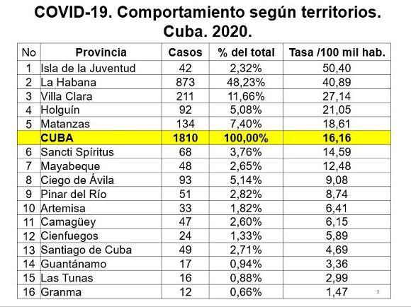 Con 873 casos, ejemplificó, la capital concentra el 48.2% de todos los casos confirmados en Cuba. Junto a la Isla de la Juventud, estas cuatro provincias mencionadas concentran el 74.7% de todos los casos reportados.