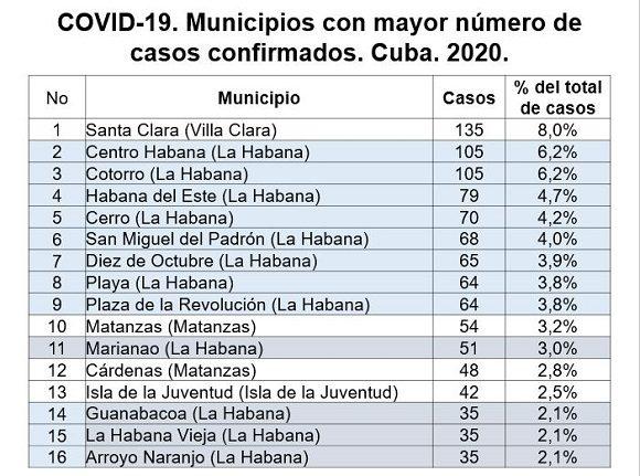 Al respecto, citó a Santa Clara, el municipio de Cuba que más casos positivos reporta con 135 enfermos y que representan el 8% del total.
