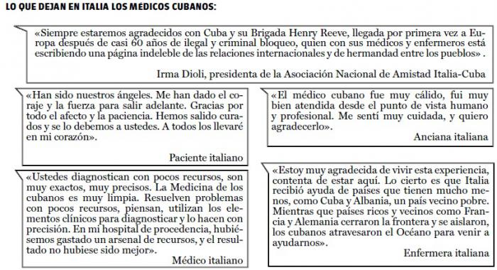 Para el doctor Fernando Graso Leyva, de 28 años, esta fue su primera misión internacionalista. Lo miro y comprendo que tiene cosas que decir: «Italia nos deja mucho: su hospitalidad, el recuerdo de las bellas personas que conocimos, pero sobre todo nos deja un sentimiento profundo de humanidad. Habrá un antes y un después, para los médicos que estuvimos aquí y para la Medicina cubana. Porque arribamos a un lugar del primer mundo donde existía toda la tecnología, todos los medios de diagnóstico, y supimos llegar con nuestros conocimientos y ponernos a la par de los médicos italianos». ¿Estarías dispuesto a cumplir otras misiones? «Sí. Yo creo que esto ha sido solo el inicio, iré a donde sea útil, lo mismo fuera que dentro del país. Siempre podrán contar conmigo».