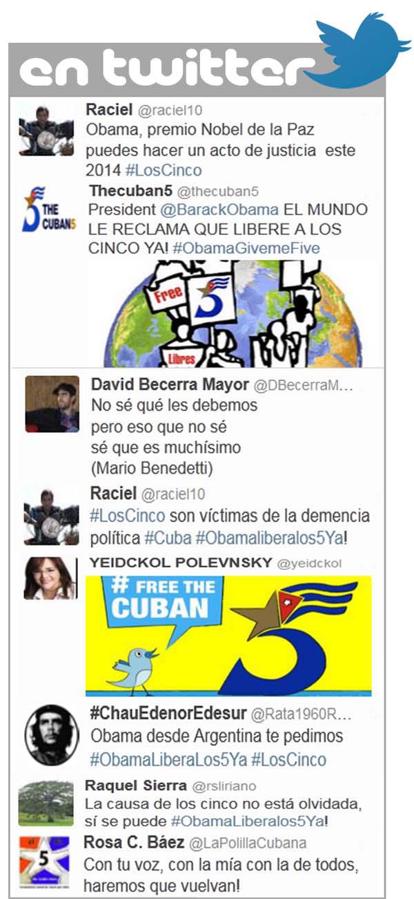 El tuitazo constituye la primera iniciativa global del 2014 en solidaridad con la causa de los luchadores cubanos y se desarrolló durante todo el día con las etiquetas #ObamaLiberalos5Ya!; #ObamaFreetheFiveNow!; #ObamaGestoHumanitarioxlos5! y #ObamaGivemeFive