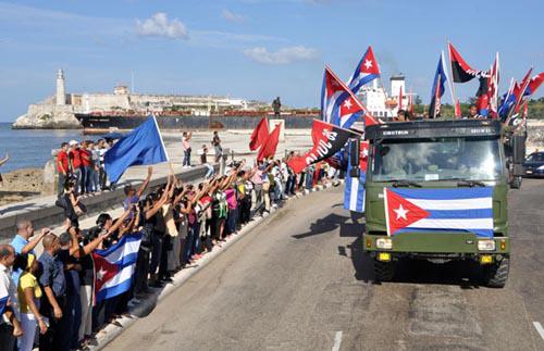 La Caravana de la Libertad continuó su recorrido por el parque 9 de abril, del Cotorro, San Francisco de Paula, la Virgen del Camino y la Avenida del Puerto, hasta llegar a la antigua Marina de Guerra, donde los presentes ratificaron el papel de la juventud cubana en la construcción del Socialismo y en el reclamo de la libertad de los Cinco.