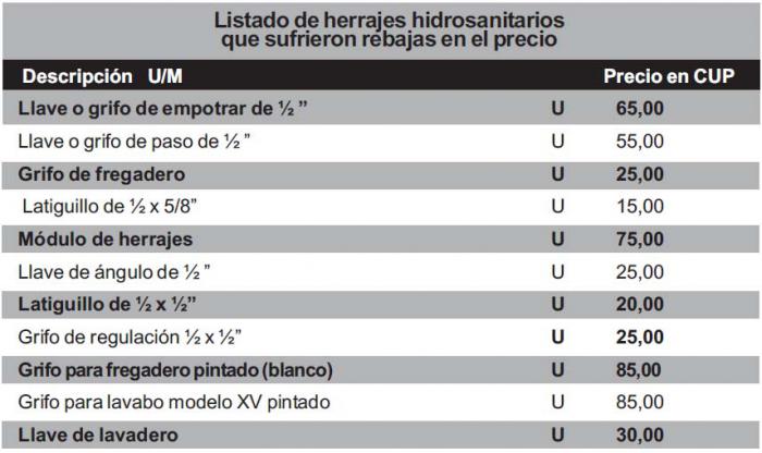 Diana Rivero Peña, dependienta de El Río, otra Tienda de Materiales de la Construcción de esa misma provincia, informó que actualmente de los renglones rebajados de precio “solo tenemos módulos de herrajes de producción nacional a 75 pesos, llaves de paso de ½ pulgada a 55 y un tipo de latiguillo a 15”.