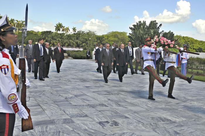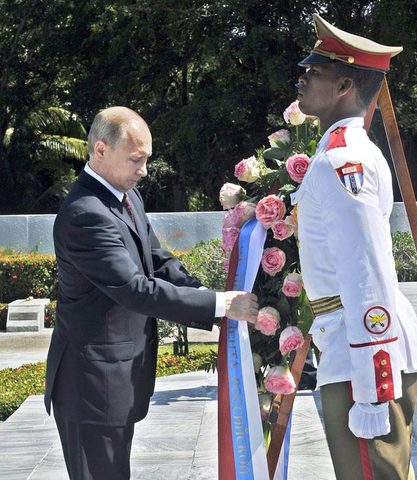 Vladimir Putin, presidente de la Federación de Rusia, y Raúl Castro, presidente de los Consejos de Estado y de Ministros de Cuba, depositaron la mañana de este viernes una ofrenda floral en el Memorial al Soldado Internacionalista Soviético, ubicado en las afueras de La Habana.