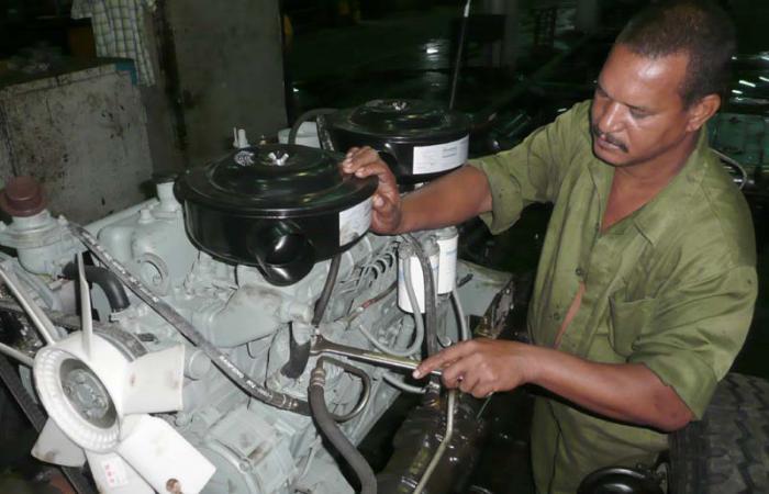 Aprovechar el tiempo es misión común. En un área próxima a la puerta de la gran nave el mecánico Marino Sánchez Lora revisa un motor marca Yuchai (fabricado en China), recién librado de sus empaques. Metros más atrás, en pleno proceso de ajuste de una unidad similar a un largo chasis, está su homólogo Rey Mora Medina.