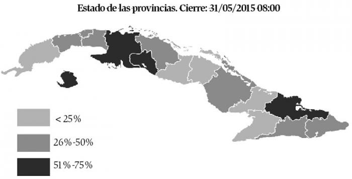 Santiago de Cuba es la provincia donde menos ha llovido con solo el 41 % del acumulado habitual, seguida de Guantánamo, 49 %, Artemisa, 57 %, Pinar del Río, 63 %, Ciego y Villa Clara, 65 %.