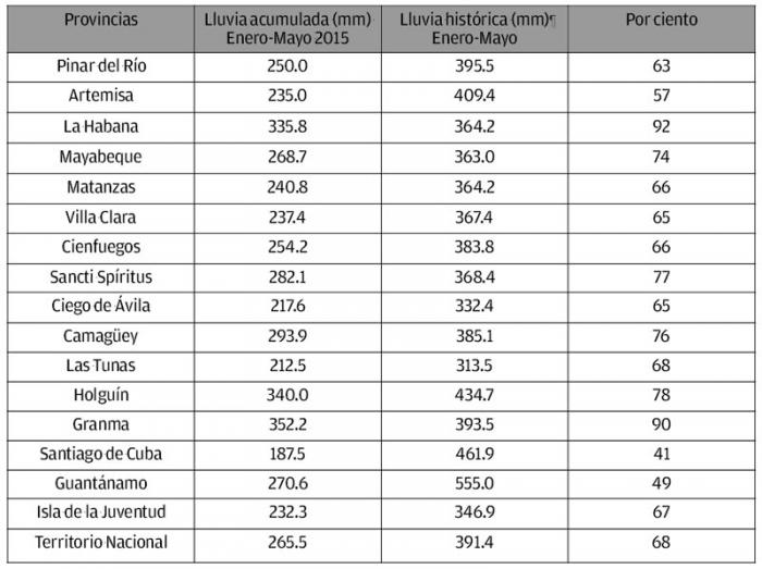 Datos aportados por el Instituto Nacional de Recursos Hidráulicos (INRH) indican que entre el primero de enero y el 31 de mayo del presente 2015 cayeron en Cuba 265,5 milímetros, cifra equivalente al 68 % del promedio histórico para ese periodo de tiempo.
